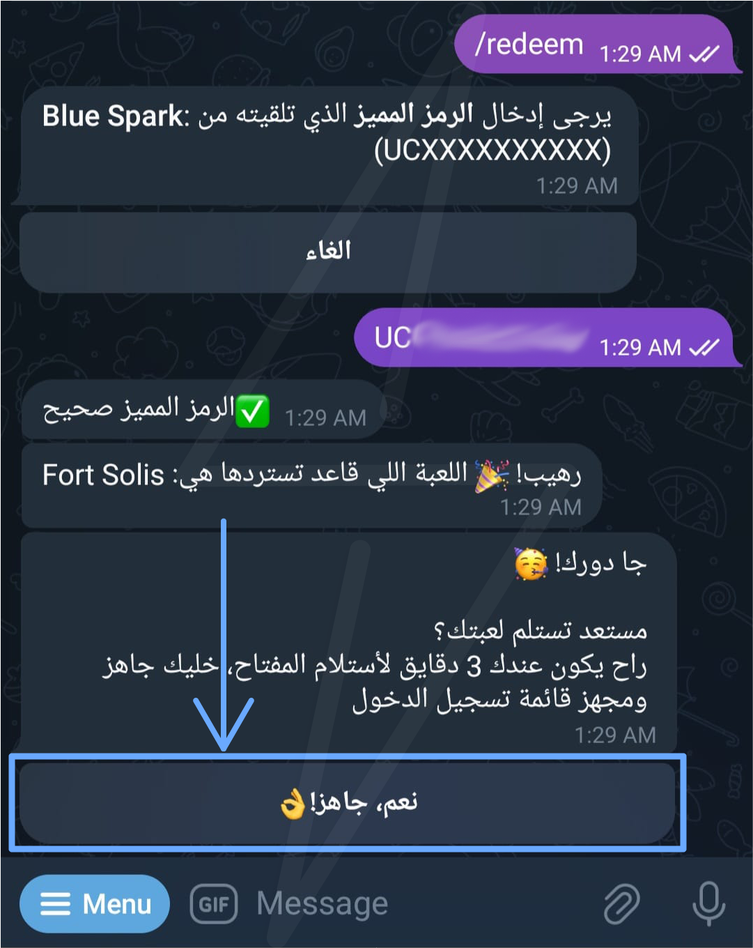 📌 8- اضغط "نعم جاهز👌" ✅ (تذكر، عندك 3 دقايق تستلم الرمز! لو فاتك، تقدر تحاول بعد 5 دقايق أو لما يخلص اللي قبلك).